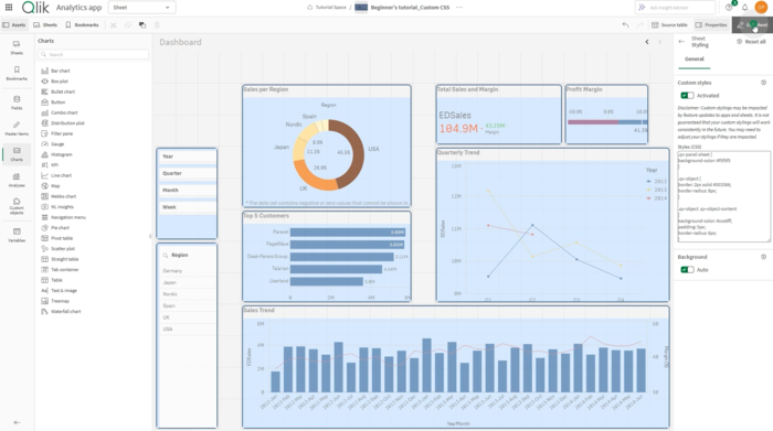 Qlik Sense eröffnet neue Möglichkeiten zur Individualisierung von Dashboards. In Kombination mit benutzerdefinierten Themes kann nun eigenes CSS direkt im Eigenschaftenfenster eines Arbeitsblatts hinterlegt werden. Dadurch lassen sich Layouts gezielt an Corporate-Design-Vorgaben anpassen. Dabei gilt: Native Einstellungen sollten bevorzugt genutzt werden, da CSS-Anpassungen nicht als stabile